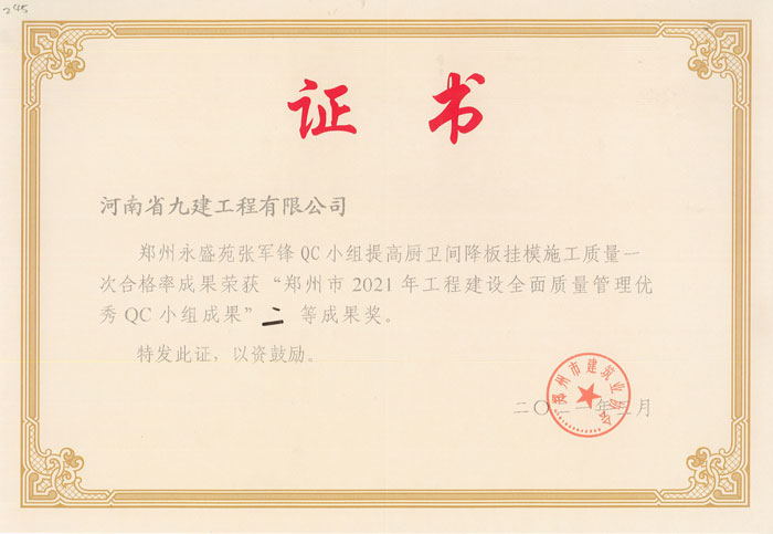 2021年郑州永盛苑张军锋QC成果市级二等奖...