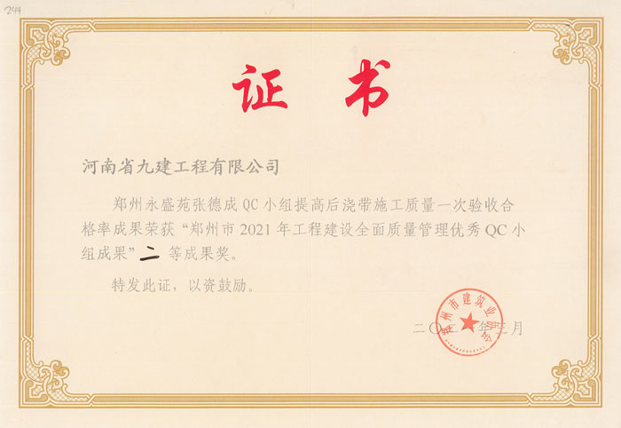 2021年郑州永盛苑张德成QC成果市级二等奖...