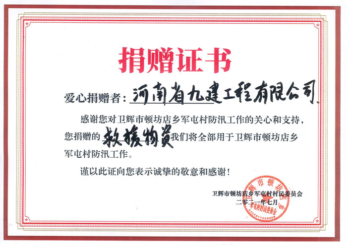 2021年卫辉市顿坊店乡军屯村防汛救援物资捐赠证书...